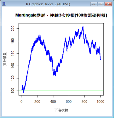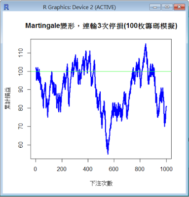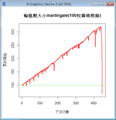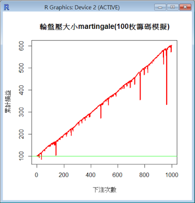 下圖是某一次模擬的結果,最後為604枚籌碼(淨賺504枚),玩1000次後還活著,安全離場。