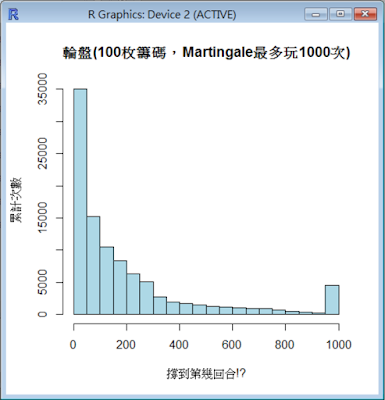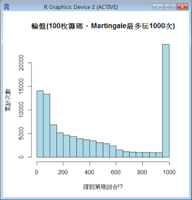 我們因此好奇一個問題。100枚籌碼,用Martingale方式玩,能在1000次後安全離場(賺錢)的機會有多少!?