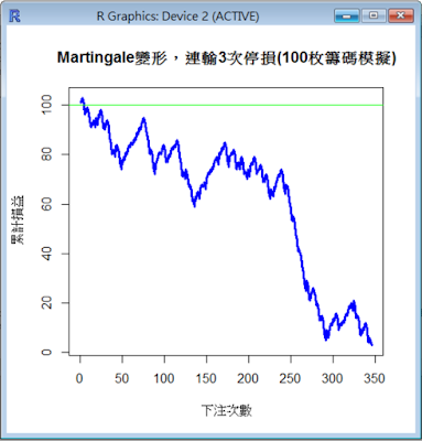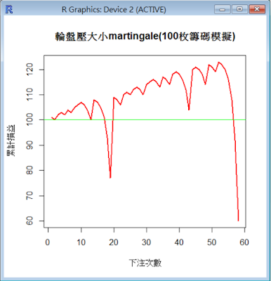 下圖是某一次模擬的結果,最後為604枚籌碼(淨賺504枚),玩1000次後還活著,安全離場。