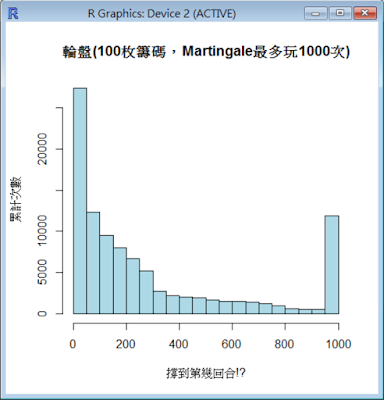 我們因此好奇一個問題。100枚籌碼,用Martingale方式玩,能在1000次後安全離場(賺錢)的機會有多少!?